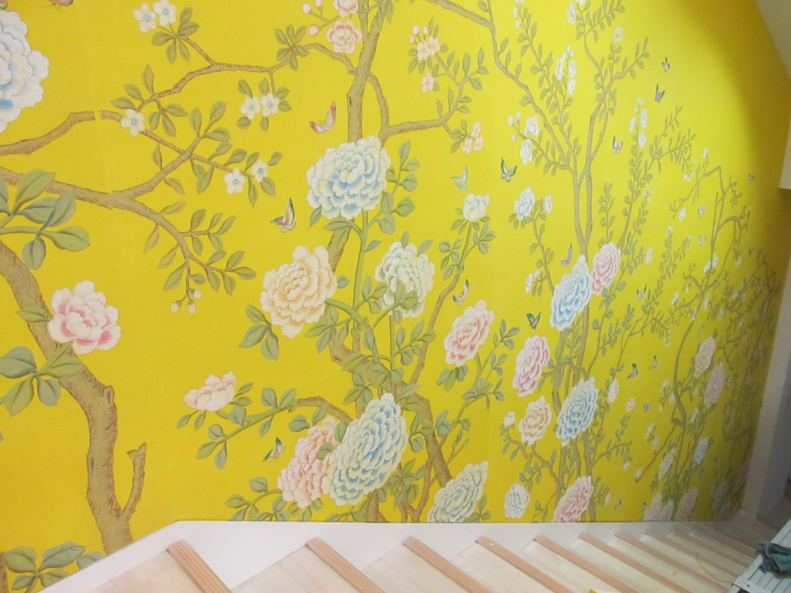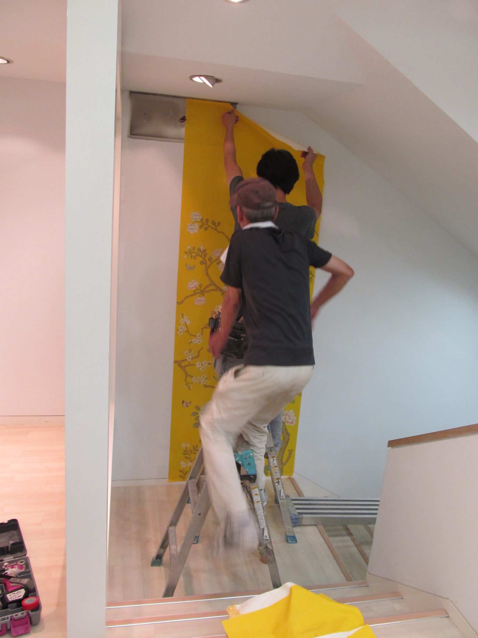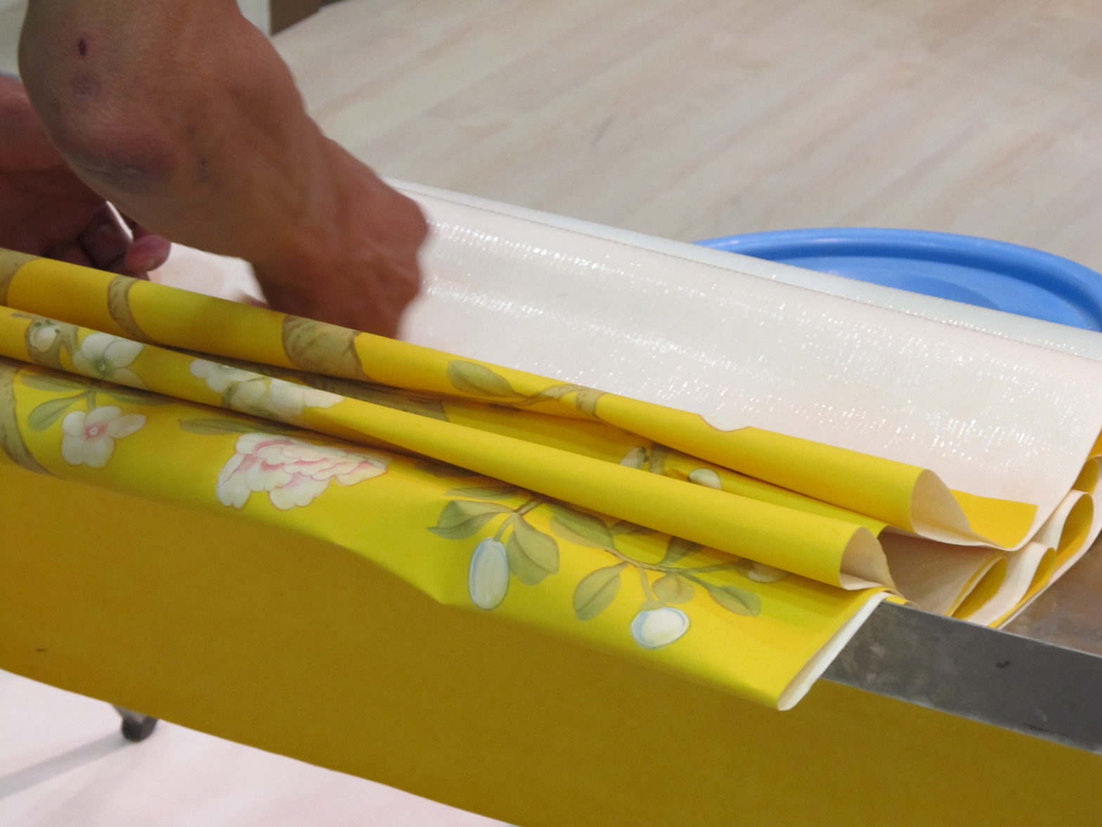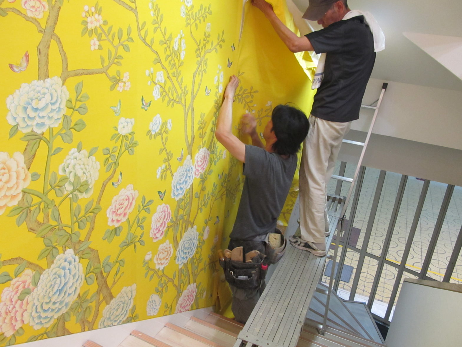 手描きシルク壁紙の施工は天然素材の壁紙と同様にに施工することができます。内装業者の方に施工をご依頼することをお勧めします。 壁面の凸凹を無くす下処理を丁寧にした後の施工となります。特に壁面一面の施工は短時間に柄合わせをしなければなりませんので2人での施工が必要です。ユーレシアンでも施工業者のご紹介等致しております。 お気軽にお問い合わせ下さい。